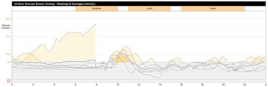 Patient’s continuous glycemic monitoring data for 7 days (Y-axis, glucose (mmol/L), X-axis, time of day; periods of hyperglycemia are indicated in yellow).