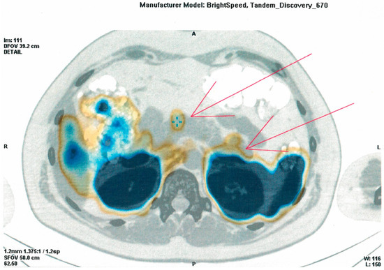 During hospitalization in the NMRCE, we conducted a fasting test. Hypoglycemia (glucose level less than 3 mmol/L) began to be recorded with a glucometer on the second day, but since the level of glycemia was more than 2.2 mmol/L and there were no symptoms (except for the usual weakness), the test continued. Hypoglycemia and neuroglycopenic symptoms were registered only at the end of the test, which lasted 51 h: hyperinsulinemic hypoglycemia was detected (glucose, 38.7 mg/dL (2.15 mmol/L), insulin, 12.97 μIU/mL, C-peptide, 2.03 ng/mL, β-hydroxybutyrate, less than 2.7 mmol/L, substances of oral hypoglycemic drugs, not found). A glucagon test was performed, and the increase in the level of glycemia was less than 1.4 mmol/L. The levels of serum chromogranin A, synaptophysin and antibodies against insulin were within the normal range. Continuous glucose monitoring in the interstitial fluid after fasting showed fluctuations from 61.2 to 329.7 mg/dL (3.4 to 18.3 mmol/L) (Figure 1), but no other criteria indicative of DM were identified. An oral glucose tolerance test was performed with the following results: fasting glucose, 5.95 mmol/L, and 2 h after loading, 6.79 mmol/L; HbA1c 5.5%; HOMA-IR 10. A CT scan of the abdominal organs with contrast confirmed the presence of pancreatic masses (six in total: four cystic, and two solid up to 36 mm—the largest one in the distal part of the tail). The patient underwent selective arterial calcium stimulation with hepatic venous sampling: the release of insulin was approximately the same from all parts of the pancreas. Scintigraphy with octreotide was performed: two foci with overexpression of somatostatin receptors were found in the distal part of the tail of the pancreas (Figure 2). The patient refused a biopsy of the pancreatic tumors.