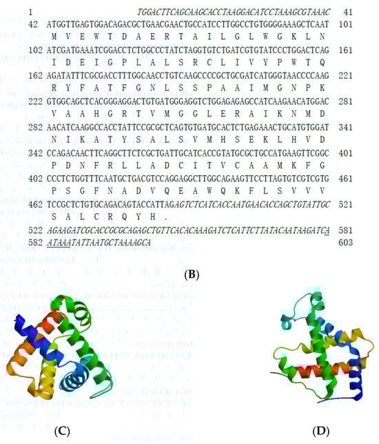 Nucleotide/amino acid sequence diagram and predicted tertiary structures of Megalobrama amblycephala hemoglobins α (A,C) and β (B,D) subunits.