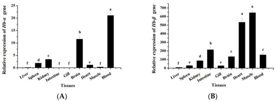 MaHbα (A) and MaHbβ (B) expression in various tissues of adult M. amblycephala. 18S rRNA is selected as the reference gene. Data are shown as means ± SE. Different letters above columns indicate statistical significance (p < 0.05).