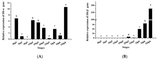 MaHbα (A) and MaHbβ (B) expression at different stages of M. amblycephala development. 18S rRNA is selected as the reference gene. Data are shown as means ± SE. Different letters above columns indicate statistical significance (p < 0.05).