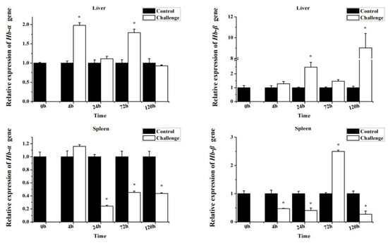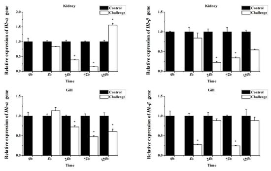 Effect of A. hydrophila infection on MaHbα and MaHbβ mRNA expression. 18S rRNA is selected as the reference gene. Data are shown as means ± SE. Asterisks (*) above columns indicate statistical significance (p < 0.05).