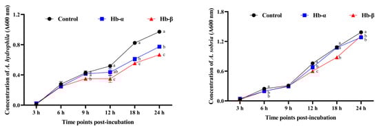 To analyze the effects of the synthesized MaHbα and MaHbβ peptides on the growth of aquatic pathogens, including A. hydrophila, Aeromonas sobria, Vibrio harveyi, Edwardsiella tarda, and Escherichia coli, their antimicrobial activities were determined using liquid growth inhibition assay in a microtiter plate assay system as previously described with some modifications []. Briefly, the bacteria were cultured to an exponential phase in a liquid LB medium at 28 °C, and then diluted (1:100) with fresh LB medium. The diluted cultures were then supplemented with synthetic MaHbα and MaHbβ peptides to a final concentration of 30 μg/mL, with the normal LB medium as the control. These bacteria were incubated at 28 °C for 24 h. The microbial growth and bacterial density in the liquid LB medium were assessed by measuring the absorbance at 600 nm at different time points (3, 6, 9, 12, 18, and 24 h) post-incubation with synthetic MaHbα and MaHbβ peptides. These assays were conducted in triplicate.