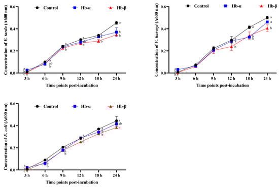 Antimicrobial activities of synthetic MaHbα and MaHbβ peptides against A. hydrophila, A. sobria, V. harveyi, E. tarda, and E. coli. Data are shown as means ± SE. Different letters above points indicate statistical significance (p < 0.05).