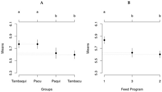 As previously mentioned, [23] arrived at a conclusion affirming the genetic superiority of the tambaqui group over the other three genetic groups (pacu, tambacu, and paqui). This finding was further supported by [26] in their study, where tambaqui outperformed both tambacu and another hybrid (Tambatinga) produced from species within the Serrasalmidae family (C. macropomum × P. brachypomus). In this study, we conducted a Tukey test on the averages generated using the mixed model, and the results demonstrated the superior performance of tambaqui compared to both paqui and tambacu (Figure 1). These findings reinforce the advantage of tambaqui in terms of growth and performance, further solidifying its prominence among the evaluated genetic groups.