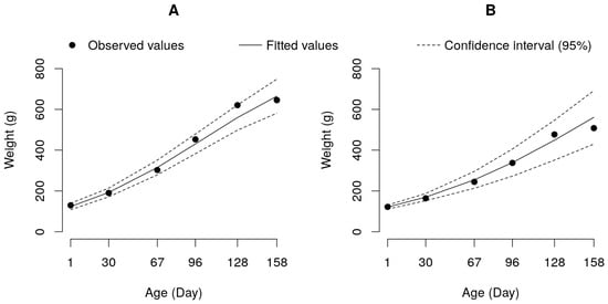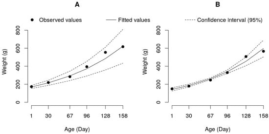 The logistic and exponential models’ parameters were assessed for the feeding programs and experimental groups using the likelihood ratio test. To ensure the validity of our results, we thoroughly evaluated all assumptions, and in the cases where violations occurred, we applied logarithmic transformations. The chosen significance level for the statistical tests was 5%.