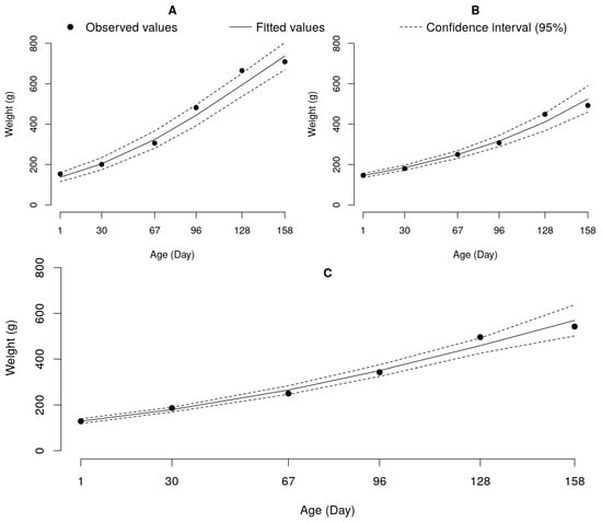 Considering other significant factors, such as the evaluation period, is crucial when interpreting the final weight results. In the studies by [21,23], the animals reached a stage close to market weight (1500 g). However, in the study conducted by [7], the final period of growth for the animals, where the growth potential of each genetic group could be determined, was not evaluated. This emphasizes the importance of studying a growth curve that estimates the growth potential and the speed of animal growth. By considering both factors, a more comprehensive understanding of the animals’ growth patterns can be achieved.