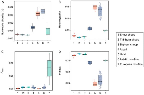 Nucleotide diversity (π) was calculated using all sites with VCFtools v0.1.17 [23] for seven wild species and five domestic sheep breeds, with a sliding window of 2 Mb and a 1 Mb sliding step. We further calculated the heterozygosity of individuals using PLINK v1.90b6.26 [24] with the “-het” option.