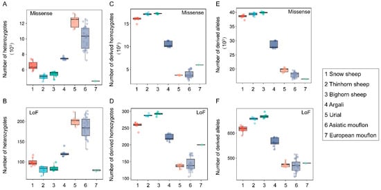The genetic load of seven wild species within the genus Ovis: (A) the number of heterozygotes-derived missense variants; (B) the number of heterozygotes-derived LoF variants; (C) the number of homozygous-derived missense variants; (D) the number of homozygous-derived LoF variants; (E) total number of allelic-derived missense variants; (F) total number of allelic-derived LoF variants.