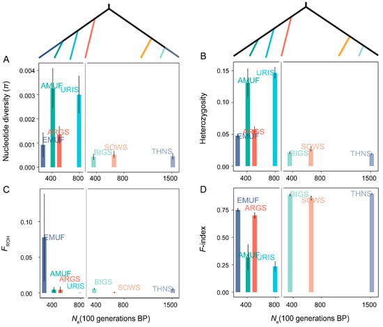 The relationship between Ne and genetic diversity among seven wild species within the genus Ovis: (A) nucleotide diversity (π); (B) heterozygosity; (C) individuals inbreeding coefficients (FROH); (D) F-index.