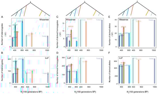 The relationship between genetic load and Ne among seven wild species within the genus Ovis: (A) the number of heterozygotes-derived missense variants; (B) the number of heterozygotes-derived LoF variants; (C) the number of homozygous-derived missense variants; (D) the number of homozygous-derived LoF variants; (E) total number of allelic-derived missense variants; (F) total number of allelic-derived LoF variants.