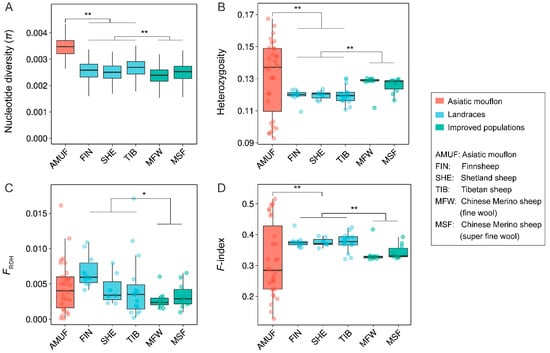 The genetic diversity and individual coefficients of Asiatic mouflon, native, and improved sheep breeds: (A) nucleotide diversity (π) of Asiatic mouflon, native, and improved sheep breeds; (B) heterozygosity of Asiatic mouflon, native, and improved sheep breeds; (C) individuals inbreeding coefficients (FROH) of Asiatic mouflon, native, and improved sheep breeds; (D) F-index of Asiatic mouflon, native, and improved sheep breeds, *: p < 0.05; **: p < 0.01.