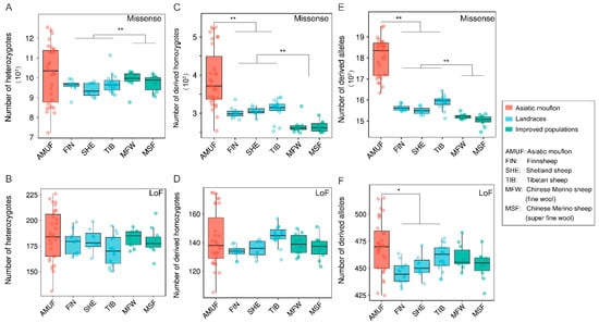 The genetic load of Asiatic mouflon, native, and improved sheep breeds: (A) the number of heterozygotes-derived missense variants; (B) the number of heterozygotes-derived LoF variants; (C) the number of homozygous-derived missense variants; (D) the number of homozygous-derived LoF variants; (E) total number of allelic-derived missense variants; (F) total number of allelic-derived LoF variants, *: p < 0.05; **: p < 0.01.