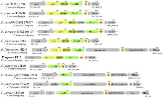 The genomic sequence of P. ogarae F113 encodes an orphan vgrG gene (PSF113_0666) downstream of the speA gene (PSF113_0665), an arginine decarboxylase, in the close vicinity of the diguanylate-cyclase encoded by the gcbA gene (PSF113_0661). The vgrG gene encodes a VgrG5a protein, homologous to T6SS export proteins, and is followed by a gene encoding a DUF4123 protein which is an orthologue of several proteins that act as adaptors for type VI-secreted effectors [21,72]. We have therefore named these genes vgrG5a and tap5a (PSF113_0667) [44]. The analysis of this region revealed that downstream of these genes and in the opposite transcription direction [73], P. ogarae F113 encodes one gene which encodes a MATE/Din7 protein domain, similar to the Multidrug and Toxin Compound Extrusion transporter [74] and a small hypothetical protein. Since this genetic organization resembles a T6SS auxiliary module [75], we have named those two genes tfe8 (PSF113_0668) and tfi8 (PSF113_0669) [44], putatively encoding a T6SS effector and its cognate immunity protein. While the orthologues of the putative toxin and immunity genes are widespread within the genus Pseudomonas, the gene cluster formed by vgrG5a and tap5a is present only in a limited number of strains, all belonging to the Pseudomonas fluorescens complex of species [45,76]. We have named this region the speA-MTase locus, since synteny is maintained by the speA gene and the gene encoding a putative MTase protein (Figure 1). Figure 1 shows the genetic organization of the speA-MTAse locus in strains belonging to different subgroups of the P. fluorescens and P. putida groups.