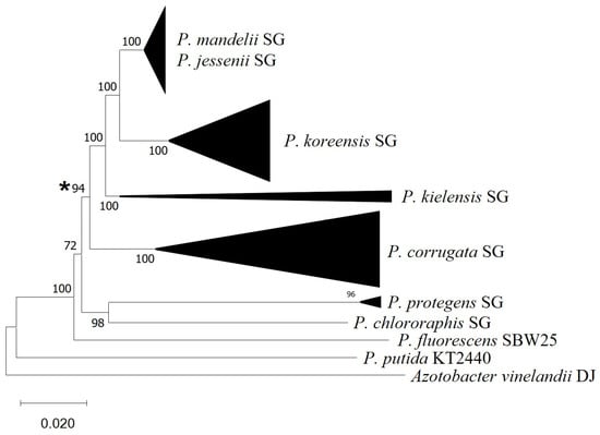In order to investigate the prevalence of this gain of function, we have investigated the presence of the vgrG5a-tap5a genes in a larger number of strains belonging to the P. corrugata, P. mandelii, P. jesseni, P. koreensis, and P. kielensis subgroups. The results have shown that the vgrG5a-tap5a are present in the vast majority of strains from these groups with genomic sequences available (Supplementary Table S2). We have not found these genes in any strains outside these subgroups. A phylogenomic tree containing all the strains tested (Figure 2 and Figure S1) shows that the presence of the vgr5a-tap5a occurs in a monophyletic group which includes the P. fluorescens subgroups P. corrugata, P. mandelii, P. jesseni, P. koreensis, and P. kielensis.