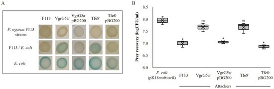Bacterial killing profile of the vgrG5a auxiliary module between P. ogarae F113 mutants and E. coli strain carrying pK18mobsacB expressing lacZ. (A) Bacterial patches obtained from the bacteria–bacteria interaction, where the blue color on LB plates (X-gal and kanamycin) indicates E. coli growth. The top row shows the growth of P. ogarae control or its insertional mutant strains. The middle row shows the growth of mixed P. ogarae/E. coli cultures after 5 h of co-incubation. Bottom row shows the E. coli reference culture. (B) Bacterial killing quantification. Box and whiskers plots indicating the amount of prey recovery from each attacker expressed as logCFU/mL. Significance was calculated using ANOVA test (* p value < 0.01); ns, not significant differences when compared to non-competing E. coli. X symbol in each box indicates the mean in each sample.