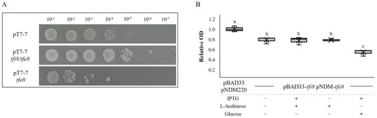 Tfe8/Tfi8 constitute an effector–immunity pair. (A) Serial dilution of bacterial survival after the expression of cloned tfe8 and tfi8/tfe8 in E. coli BL21(DE3) cells. The top row corresponds to the control strain carrying an empty pT7-7 vector, the middle row corresponds to the induced cells of the cloned tfi8/tfe8 genes in pT7-7, and the lower row to the induced cells of the cloned tfe8 gene. All the strains present similar survival without induction. (B) Growth inhibition assays. Box and whiskers plot showing the growth of the E. coli DH5α-tfi8/tfe8 strain containing pBAD33-tfi8 and pNDM220-tfe8 plasmids in liquid culture. Significance was calculated using ANOVA with a Tukey test, where a and b (p value < 0.01), b and c (p value < 0.001), and between a and c (p value < 0.001). Optical density was recorded for over 24 h. Optical density was relativized to the of E. coli DH5α carrying the empty plasmids pBAD33 and pNDM220.