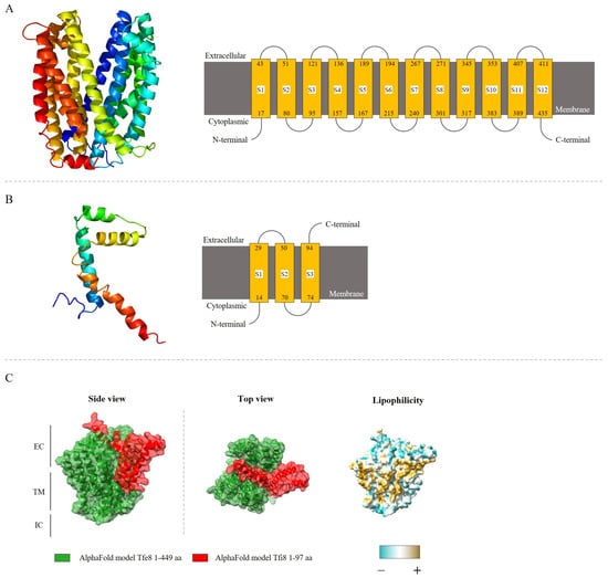 The analysis of the subcellular localization of the putative immunity protein pair, Tfi8 and Tfe8, was made through a bioinformatics approach using the prediction tools PSORTb version 3.0.2, Phyre2 version 2.0, and AlphaFold version 2.3.2. These analyses indicate that both proteins are transmembrane proteins (Figure 5), where the toxin protein Tfe8 possesses between ten and twelve transmembrane domains, depending on the bioinformatics approach employed. The Tfe8 protein could form a possible pore in the target bacterial cell membrane (Figure 5A), and the analysis of the protein residues from Tfe8 revealed that 98% of this sequence has been modeled with 100% confidence by the single highest scoring template, and according to the Research Collaboratory for Structural Bioinformatics RCSB protein data bank, these template structures are related with the Multidrug and Toxin Compound Extrusion (MATE) transporter present in V. cholerae [78] and E. coli [79].