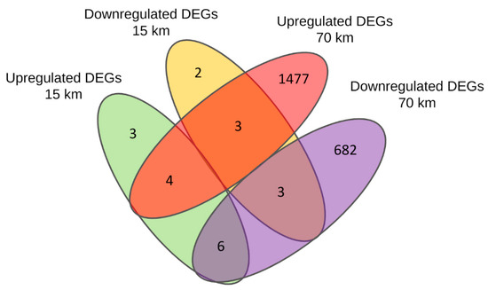 In the long-distance group, we found 2175 DEGs (1484 upregulated and 691 downregulated). In the short-distance group, there were only 21 DEGs (13 upregulated and 8 downregulated). The complete lists of all found DEGs in both long- and short-distance runs with gene names, fold change (FC), and false discovery rates (FDR) are given in Tables S1 and S2. The number of up- and downregulated genes that overlap between both the long- and short-distance groups can be seen in the Venn diagram (Figure 1; see also Table 1). In particular, 16 of the 21 DEGs of the short-distance group overlap with the DEGs of the long-distance group, while five apply only to the short-distance DEGs (three upregulated, two downregulated).
