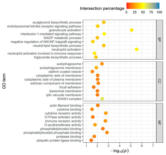 Among the top-10 biological processes (BPs), the focus is on fatty acid metabolism (acylglycerol, neutral lipid, and triglyceride biosynthetic process) and immune response (neutrophil and granulocyte activation, toll-like receptor signaling pathway). The cellular components (CCs) primarily list reactions that influence membranes, and the molecular functions (MFs) refer to enzyme reactions that are particularly related to the biological processes (O-acyltransferase and cytokine activity) mentioned but also to cell proliferation and cell membrane actions (phosphatidylinositol binding).