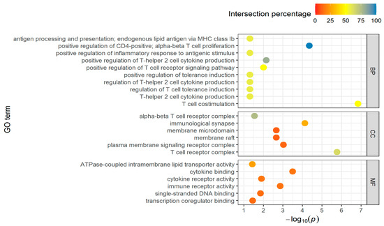 Top-10 GO terms of BPs, CCs, and MFs for downregulated DEGs in the long-distance group, taking into account the proportion of found genes that are overlapping with the total number of genes in the GO term (intersection percentage) and the negative log10 of the adjusted p-value.