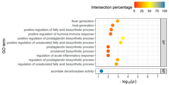 The five annotated downregulated genes are integrated in 32 biological processes, no cellular component, and one molecular function term (Table S5). After filtering using the intersection percentage, eleven biological processes and one molecular function GO term with four genes each appear to be particularly relevant (Figure 4).