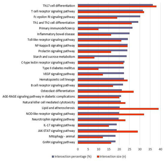 Pathway analysis: Using KEGG analysis, we obtained 81 significantly overrepresented pathways in the long-distance group. Of these, 48 pathways are of particular interest because 8 are primarily associated with cancer and 25 with infectious diseases (Table S6). The top-20 (sorted according to intersection percentage) are shown in Figure 5.