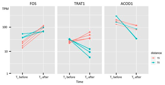 An example of the changes in expression of three genes in terms of transcripts per million (TPM) before and after the run is given in Figure 6. The expression changes in all genes in both groups (long- and short-distance) are given in Figure S1.
