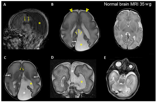 Brain MRI images of patient 1 in the postnatal period at approximately 35 weeks gestational age demonstrate multiple congenital anomalies. (A) Sagittal T1-weighted image shows the presence of the corpus callosum, which is not properly developed (arrows). The posterior portion (the splenuim) is located further anterior than normal. CSF fills most of the posterior supratentorial compartment (asterisk). Note motion artifacts in the basal regions of the brain. (B) Left: Axial T2-weighted image shows an expansion of the left supratentorial cranial cavity (interhemispheric cyst) filled with CSF (asterisk) in the parietooccipital region of the left hemisphere. The posterior falx cerebri (white arrow) is shifted toward the right hemisphere. The splenium of the corpus callosum is visible (yellow arrows). There is primitive gyrosulcal patterning, more prominent in the frontal lobes (arrowheads), consistent with 28–29 weeks of gestation. Right: Axial T2-weighted image shows normal gyrus and sulcus formation at 35 weeks of gestation (wg). (C) Axial T2-weighted image shows the interhemispheric cyst (white asterisk) communicating with the enlarged left lateral ventricle (yellow asterisk). The genu of the corpus callosum is visible (yellow arrows). The sylvian fissures (white arrows) appear underdeveloped in both hemispheres. (D) Coronal T2- weighted image shows the communication of the CSF space (interhemispheric cyst) (white asterisk) with the lateral ventricle (yellow asterisk) on the left side through a broad parenchymal defect in the medial temporoparietal region. (E) Axial T2-weighted image shows pronounced left microphthalmia, without detectable lens.
