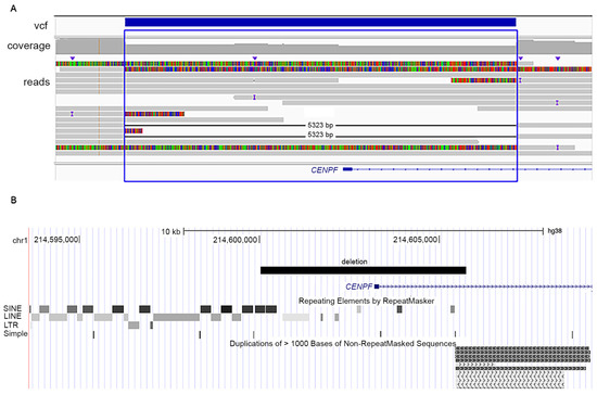 (A) LR-WGS data of patient 3 showing a 5323 bp deletion in CENPF: Chr1(GRCh38) g.214600232-214605555, covering exon 1 and part of intron 1. The blue bar indicates the deletion as annotated in the vcf file. Soft clips (colorful bars) identify reads that span the deletion and only partially align to the reference genome. The deletion was present in a heterozygous state. Data are shown in IGV [27]. (B) Screenshot from UCSC genome browser showing the genomic location of the heterozygous 5323 bp deletion overlapping CENPF exon 1 in patient 3. The proximal breakpoint of the deletion is embedded in a region enriched of repetitive elements. The distal breakpoint of the deletion overlaps segmental duplications.