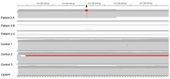 RNA-seq data of patient 3 (biological triplicates, A–C) and three controls (Control 1–3). In patient 3, only one of the three replicates detected sequence reads from this region of CENPF, which indicated monoallelelic expression as all five reads contained c.892G>T. Data are shown in IGV [27].