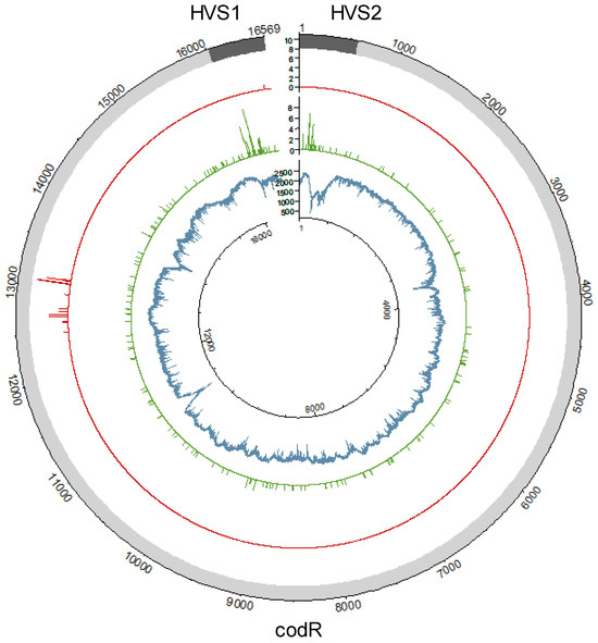 The distribution of coverage was evaluated for 100 samples, which were representative of the overall SweGen dataset (Table 1). The average read depth at each position was calculated based on the read depths observed in the data subset. This overall average read depth was 2328X and ranged from 411X to 2805X (Figure 1). Read depths were relatively consistent across the mitogenome, with approximately 10% variation in the overall average read depth and an interquartile range of 240X (Figure S2). However, there were 855 positions (5.2% of the mitogenome) with substantially lower read depths (less than 1883X). Most (760; 88.8%) of these low-coverage positions were localized to four regions: nps 217–598 (373), 3490–3634 (65), 10,891–11,043 (120), and 13,674–14,071 (202). The large proportion (43.6%) of the positions below 100X in the nearly complete and incomplete haplotypes occurred across nps 217–598 due to the presence of the three C-stretches (nps 303–309, 456–469, 568–576). In fact, several C-stretches are present in all four low-coverage regions, and HiSeq chemistry has previously been shown to exhibit poor sequencing in homopolymer regions [52]. As a result, reads in these regions were of generally poor quality, and thus read depths were reduced. Sequencing errors specific to polycytosine residues combined with the high-stringency mapping parameters employed to eliminate NUMTs are likely to have contributed to the low coverage observed in these regions.