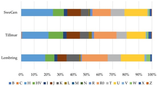 The haplogroups observed in the SweGen dataset were consistent with previously published Swedish mtDNA data [16,17]. However, differences in the sequencing range of each Swedish dataset impacted the level of haplogroup refinement. For example, there was a high proportion of R0 haplogroups (18.4%) observed in the HVS data of Lembring et al. [16], whereas a greater proportion of H haplotypes (44.6%) were observed in the SweGen mitogenome dataset (Table S1). This is explained by the increased haplogroup resolution possible with sequencing larger portions of the mitogenome, resulting in the refinement of the R0 haplotypes from HVS data to H haplogroups with entire mitogenomes (Figure S4). A comparison of updated haplogroup predictions based on HVS regions confirmed this since the updated haplogroup predictions utilized the same prediction tool and target region for the three Swedish datasets (Figure 3). This analysis showed no significant difference in HVS haplogroup frequencies between the three Swedish population datasets (p > 0.13), although the SweGen still had a slightly higher proportion of H haplogroups than R0, in contrast to the other two Swedish datasets. When comparing the CR haplogroup frequencies between the Tillmar et al. [17] and SweGen datasets, a range that was not sequenced for the Lembring et al. dataset [16], there was no significant difference (p = 0.88; Figure S5). Minor differences in haplogroup proportions are not unexpected and likely the result of sampling variation as well as the size of the populations, as the SweGen dataset is over three times larger than the other two Swedish datasets.