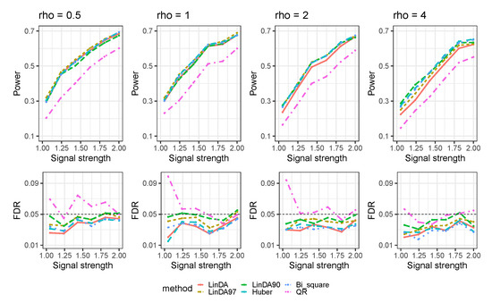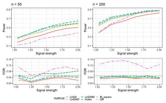 We evaluated six methods in our comparative analysis, namely LinDA [18] without winsorization (referred to as LinDA), LinDA with winsorization at the 97% quantile (referred to as LinDA97), LinDA with winsorization at the 90% quantile (referred to as LinDA90), M-estimation method with Huber’s loss (referred to as Huber), M-estimation method with Tukey’s bisquare loss (referred to as Bi_square), and quantile regression method (referred to as QR). To implement the Huber and bisquare methods, we used the rlm function in the MASS package (version: 7.3-60) in R to perform the regression estimation. For the selection of hyperparameters, we considered 10 values of c equally spaced within the interval on a log scale for the Huber method. For the Bi_square method, we took 10 values of equally spaced within the interval on a log scale. We used the rq function in the quantreg package (version: 5.95) in R to implement quantile regression. Similar to the Huber method, we took into account the quantile level that is evenly distributed across the interval with an adjacent difference of (resulting in a total of 11 values).