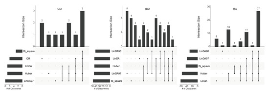 First, we compared the detection power of all methods discussed in Section 3 across the three datasets. Figure 5 presents the number of discoveries at various FDR levels (0.01–0.25). For the CDI dataset, the LinDA97, LinDA, and Huber methods exhibited the highest number of discoveries at an FDR level of . As the FDR level increased, the Bi_square method identified the most discoveries. For the IBD dataset, all methods except QR had a similar number of discoveries at an FDR level of . However, the Bi_square and Huber methods outperformed others regarding discoveries at different FDR levels in the overall analysis. Conversely, the LinDA and Huber methods consistently identified the most discoveries across all FDR levels in the RA dataset. Therefore, the Huber method displayed superior discovery capability overall. It is worth mentioning that the QR method consistently yielded the fewest discoveries in all three datasets, which is consistent with our simulation results.