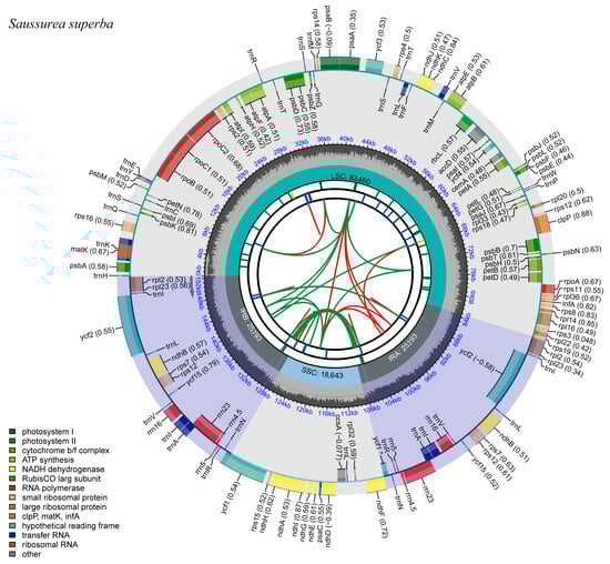 Previous studies have shown that the plant chloroplast genome, which together with the central nuclear genome and the mitochondrial genome constitutes a complete plant cell, is an effective way to achieve species identification [8,9]. In addition, chloroplasts, like the mitochondria, are double-membrane-bound cytoplasmic organelles whose origin can be traced back at least one billion years to the prokaryotic organisms of a photosynthetic cyanobacterium [9,10,11]. Over a long period of evolution, chloroplasts have become indispensable organelles to allow green plants to carry out life activities such as photosynthesis and carbon fixation [12]. They are involved in the synthesis of fatty acids and amino acids in the plant body [13], and they possess a set of structurally complete genomes [14], which usually does not exceed 160 kb, including a large single-copy region, a small single-copy region, and two inverted repeat regions, [15]. Compared with the nuclear and mitochondrial genomes, they have the advantages of easy discernment of their age characteristics, easy access to sequences, a more conserved gene composition and structure, rich genetic information, and high species discrimination [9,16]. These characteristics are of great significance for the identification of Saussurea plant species, which have complex germplasm relationships and a rich diversity.