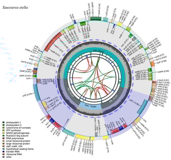The full-length sequences of the chloroplast genomes of the three Saussurea plants were 152,586 bp (S. katochaete), 152,490 bp (S. superba), and 152,442 bp (S. stella), respectively. Additionally, they were double-stranded loops with a typical quadripartite structure, as in most herbaceous plants. Two inverted repeat regions (IRs) separate the large single copy (LSC) and small single copy (SSC) regions (Figure 1, Figure 2 and Figure 3). In the IR regions of S. katochaete, S. superba, and S. stella, the IRa lengths were found to be 25,193 bp, 25,193 bp, and 25,201 bp, and the IRb lengths were 25,193 bp, 25,193 bp, and 25,201 bp, respectively. The lengths of the LSC regions were 83,551 bp, 83,460 bp, and 83,457 bp. The SSC region lengths were 18,649 bp, 18,644 bp, and 18,583 bp, respectively (Table 1). The GC contents of the three Saussurea plants were similar (37.68–37.69%), and the GC contents of the IR region (43.12–44.28%) were higher than those of the LSC region (35.80–35.94%) and the SSC region (31.39–31.40%) (Table 1). This might be related to the higher GC-rich rRNA and tRNA gene contents [14,19]. The AT content (62.31–62.32%) was greater than the GC content (37.68–37.69%), indicating the same characteristics as other plant chloroplast genomes, i.e., the AT bias was obvious [20].