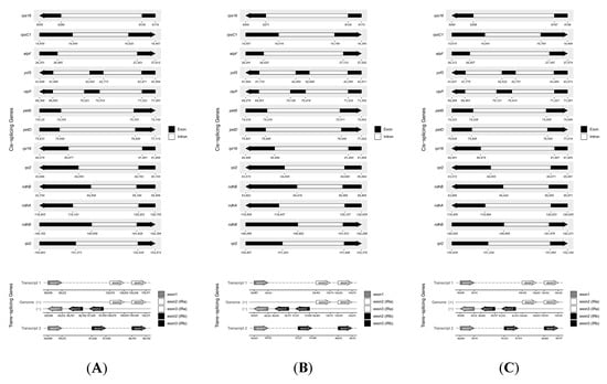 Schematic representation of cis-splicing and trans-splicing in S. katochaete (A), S. superba (B), and S. stella (C).