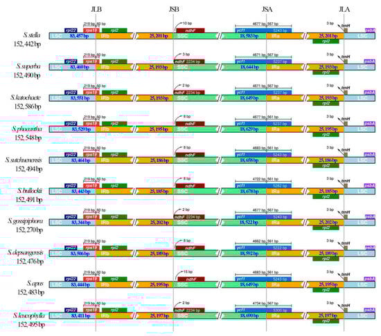In this study, we comparatively analyzed the boundaries of the IR region of the chloroplast genomes of S. katochaete, S. superba, and S. stella with those of seven closely related species: Saussurea phaeantha, Saussurea sutchuenensis, Saussurea apus, Saussurea depsangensis, Saussurea gossipiphora, Saussurea bullockii, and Saussurea leucophylla (Figure 5). The results showed that the lengths of the chloroplast genomes of the 10 Saussurea plants range from 152,270 (S. gossipiphora) to 152,586 (S. katochaete) bp. The length of the IR region was found to be 25,185 (S. bullockii) to 25,202 (S. gossipiphora) bp. The length of the LSC region was found to be 83,344 (S. gossipiphora) to 83,551 (S. katochaete) bp, and the length of the SSC region was found to be 18,522 (S. gossipiphora) to 18,690 (S. leucophylla) bp. The chloroplast genes of the 10 species differed in length by 316 bp. The LSC region differed by 207 bp, the SSC region differed by 168 bp, and the IR region differed by 77 bp. The IR showed a high degree of conservatism with the LSC and SSC boundaries, and genes spanning or close to the boundaries of the IR and SC regions mainly included rps19, rpl22, rpl2, ycf1, ndhF, and trnH. Among them, ndhF, which is involved in photosynthesis, is located across the JSB boundary, 2–15 bp away from the JSB boundary. The ycf1 gene crosses the JSA boundary and extends from 5222 (S. depsangensis) to 5300 (S. leucopphylla) bp towards the Ira region and from 18,522 (S. gossipiphora) to 18,690 (S. leucophylla) bp from the IRa region towards the SSC region. The rps19 gene extends 6 bp towards the IRb region. The JLA boundary is located between rpl2 and trnH.