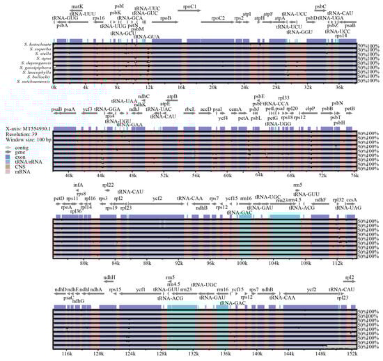 Comparative genomic analyses of 10 species of Saussurea. Gray arrows indicate the gene orientation, pink indicates non-coding sequences, purple indicates exons, light blue indicates rRNAs, and white bumps indicate different regions of chloroplast genes. The x-axis delineates the aligned nucleotide positions from the S. phaeantha chloroplast genome (MT554930.1), and the y-axis displays pairwise identity percentages, spanning from 50% to 100%.