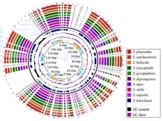 The BLAST Atlas results of chloroplast genomes of 10 Saussurea species. The CDS regions in the reference genome were BLASTed against the CDS regions in the query genomes, and the top hits were rendered in a genome map using GView. The purple and black wave charts represent the GC content and skew. The innermost slot on the map (orange) shows the CDS regions on the reference genome. The reference was S. katochaete. From the outside to the inside, they represent S. phaeantha, S. sutchuenensis, S. bullockii, S. leucophylla, S. gossipiphora, S. depsangensis, S. apus, S. stella and S. superba.