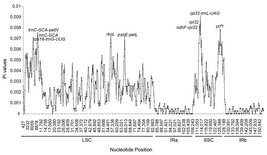 A total of 1112 variable (polymorphic) sites were identified in 151,485 nucleotide sites, including 694 single variable sites (SVS) and 418 parsimony information sites (PIS). Two different types were observed under SVS: 690 for two variable sites (SV2V) and four for three variable sites (SV3V). Similarly, there were two types of PIS: four loci with two variants (PIS2V) and seven loci with three variants (PIS3V). In addition, to quantify the level of nucleotide polymorphisms, the chloroplast genomes of 10 Saussurea plant species were compared and analyzed using DNAsp software(Version: v.5.10.01). The results showed that the Pi values of nucleotide polymorphisms in the chloroplast genomes of the 10 Saussurea species varied from 0 to 0.00911, with a mean value of 0.00200. At least nine highly variable regions are included in the Saussurea chloroplast genomes, i.e., rpl32-trnL-UAG, rpl32, ndhF-rpl32, ycf1, trnC-GCA-petN, trnC-GCA, rpcL, psbE-petL, and rpl16-trnG-UUG. These genes or gene spacer regions have high variability (Pi > 0.007). The highest values of nucleotide variation (Pi) found were 0.00911, 0.00828, 0.00806, 0.00786, 0.00753, 0.00719, 0.00719, 0.00714, and 0.00711 (Figure 8). These can be used as a potential DNA barcode for Saussurea species.