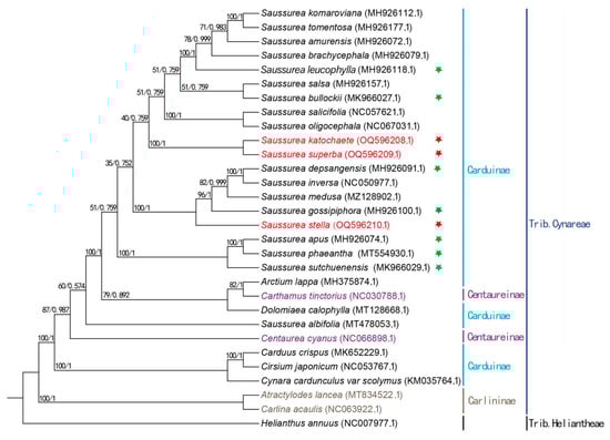 To clarify the phylogenetic positions of S. katochaete, S. superba, and S. stella in Saussurea, 20 Saussurea plants and nine other Compositae, Trib. Cynareae plants were studied, and the Compositae, Trb. Heliantheae, Helianthus, and Helianthus annuus were used as an outgroup (Table 12). They were analyzed by a multiple sequence comparison using MAFFT software (Version: v7.487), and then IQ-TREE software (Version: v.1.6.8.) was used to construct an ML tree (maximum likelihood method) using the TVM+F+I+G4 model and a BI tree (Bayesian method) using MrBayes (Version: v. 3.2.6.) using the GTR+I+G model with 2,000,000 generations and a sampling frequency of 100. The visualization was performed using ITOL software (http://itol.embl.de/ accessed on 17 August 2023).