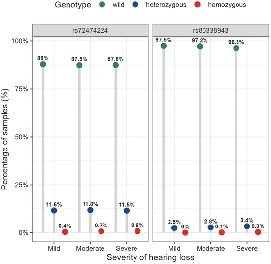 3.3. Distribution of Audiogram Shapes for the Different Genotypes of rs72474224 (c.109G>A) and rs80338943 (c.235delC)