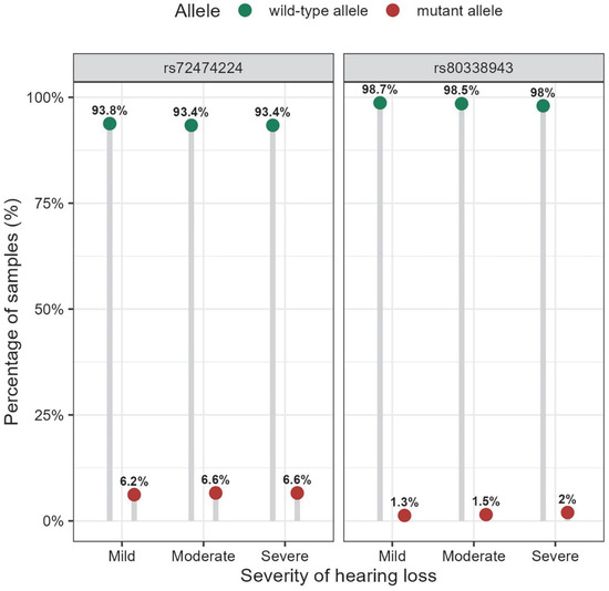 However, regarding c.235delC, the most common mutation reported in the Chinese population with hearing loss, the frequency distributions of its genotype and allele were not found to differ significantly between controls and cases (Table 2). The carrier frequency of c.235delC was 1.1% in the general population controls (Table 2). Among the 5742 patients with hearing loss, the carrier frequency was 1.4%, and only two patients were identified with homozygous mutations (Table 2), with proportions of 0.1% and 0.3% in moderate and severe–profound hearing loss, respectively (Figure 1). Additionally, there was no significant difference in the allele frequency of c.235delC between the different hearing loss severity groups (p = 0.661) (Figure 2).