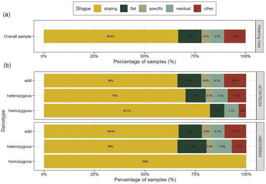 Figure 3a shows the distribution of audiogram shapes in the overall hearing loss group: 66.6% were sloping, 11.6% were flat, 4.5% were special, 6.7% were residual, and 10.6% were other. We analyzed the audiogram shape distributions of the two pathogenic variants (c.109G>A, and c.235delC) under different genotypes. As shown in Figure 3b, the c.109G>A and c.235delC variants presented various audiogram shapes, mainly showing sloping and flat types. The proportions of the sloping type in the c.109G>A heterozygous and homozygous genotypes were 70% and 82.1%, and the proportions of the flat type were 10% and 7.1%. For the c.235delC variant, the proportions of the sloping phenotype were 66% in the heterozygous genotypes and 100% in the homozygous genotypes; the flat phenotype was 14.4% in the heterozygous genotype.