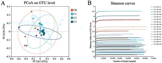 In total, Illumina MiSeq obtained more than 20,000 high-quality readings. After removing chimeras and sequences with a count of 1, representative unique sequences were selected and clustered into OTUs at 97% similarity. Most samples had between 200 and 300 OTUs, although the maximum was 605 OTUs. The average merged sequence length was 428 nucleotides. The community diversity, richness, and coverage were high for each sample (Table 1), demonstrating the suitability of these data for further analyses. The rarefaction curves, which reflected the microbial diversity of each sample at a range of sequencing depths, reached the asymptote prior to the true number of reads per sample (Figure 1B), demonstrating that the sequencing depth was sufficient to accurately represent community diversity in the sequenced samples.