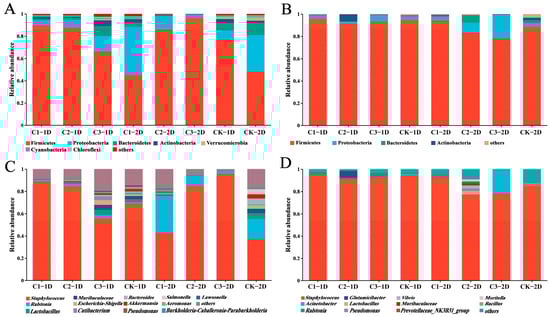 Bacterial abundance changes among Propylea japonica treated with several concentrations of the Cry1B for two lengths of time: (A,B) Relative abundance of bacterial taxa at the phylum level in (A) second- and (B) third-instar P. japonica larvae. (C,D) Relative abundance of bacterial taxa at the genus level in (C) second- and (D) third-instar P. japonica larvae. All taxa with a relative abundance of <0.01 in all samples were merged into a single taxon called “other”. C1: 0.25 mg/mL Cry1B; C2: 0.5 mg/mL Cry1B; C3: 1.0 mg/mL Cry1B; and CK: sucrose control group.