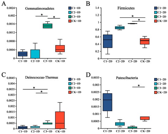 Among third-instar larvae, the dominant phyla in the sucrose control group were consistent between those treated for 24 and 48 h: Firmicutes, Proteobacteria, Bacteroides, and Actinobacteria. The abundance of each dominant phylum did not show consistent changes along with increases in the Cry1B treatment concentration (Figure 3B). For example, after 24 h treatment with 0.25, 0.5, and 1.0 mg/mL Cry1B, the abundance of Firmicutes (95.73%, 91.46%, and 93.40%, respectively) and Proteobacteria (3.23%, 1.78%, and 5.55%, respectively) first decreased and then increased. In contrast, P. japonica treated for 48 h showed consistent decreases in the abundance of Firmicutes as the Cry1B concentration increased from 0.25 to 0.5 and 1.0 mg/mL Cry1B (94.37%, 83.29%, and 78.31%, respectively). However, differences in the abundance of the four dominant phyla at 24 and 48 h of treatment compared to the control were not statistically significant (p = 0.721 and 0.691, respectively, for Firmicutes; 0.227 and 0.698, respectively, for Protobacteria; 0.341 and 0.396, respectively, for Bacteroides). There were no other notable changes in the abundance of non-dominant taxa; Deinococcus-Thermus abundance was only markedly different between treatment groups (C2_1D with C3_1D) (Figure 4C).