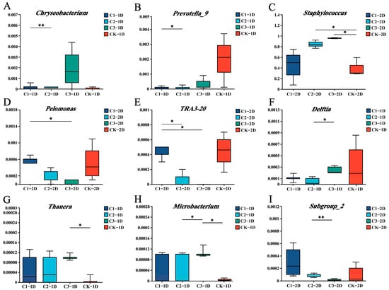 Relative abundance of endophytic bacterial genera among Propylea japonica treated with Cry1B or a sucrose control: (A–E) Differences in the bacterial communities of second-instar larvae treated for (A,B) 24 h (2L1D) or (C–E) 48 h (2L2D). (F–I) Differences in the bacterial communities of third-instar larvae treated for (F–H) 24 h (3L1D) or (I) 48 h (3L2D). Data are shown only for genera with statistically significant differences between groups. * p ≤ 0.05, ** p ≤ 0.01 (one-way analysis of variance). C1: 0.25 mg/mL Cry1B; C2: 0.5 mg/mL Cry1B; C3: 1.0 mg/mL Cry1B; and CK: sucrose control group.